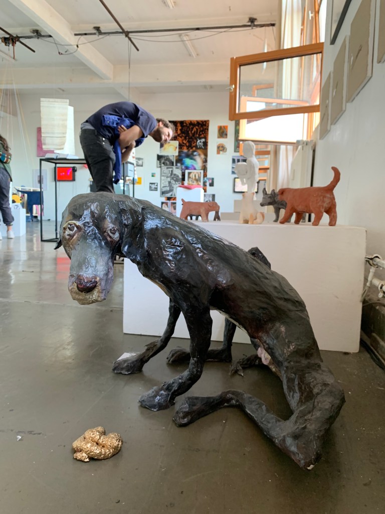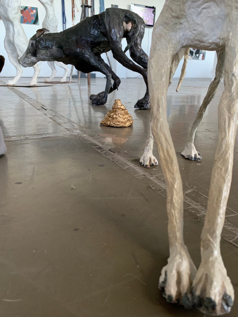 Alle Bilder oben wurden geschossen auf der Ausstellung ‘Hundert Hunde’, die im Sommer 2022 in Berlin – glänzend – kuratiert wurde von den Hunde- und Kunstliebhaber*innen Charlotte Herold und Vincent Hüdepohl. Die flotten Pappmachéhunde, die z.T. vordergründig auf den Bildern mit zu sehen sind, stammen von Paula Breuer.