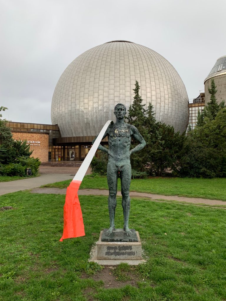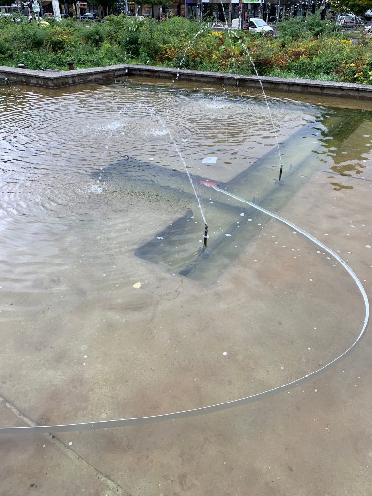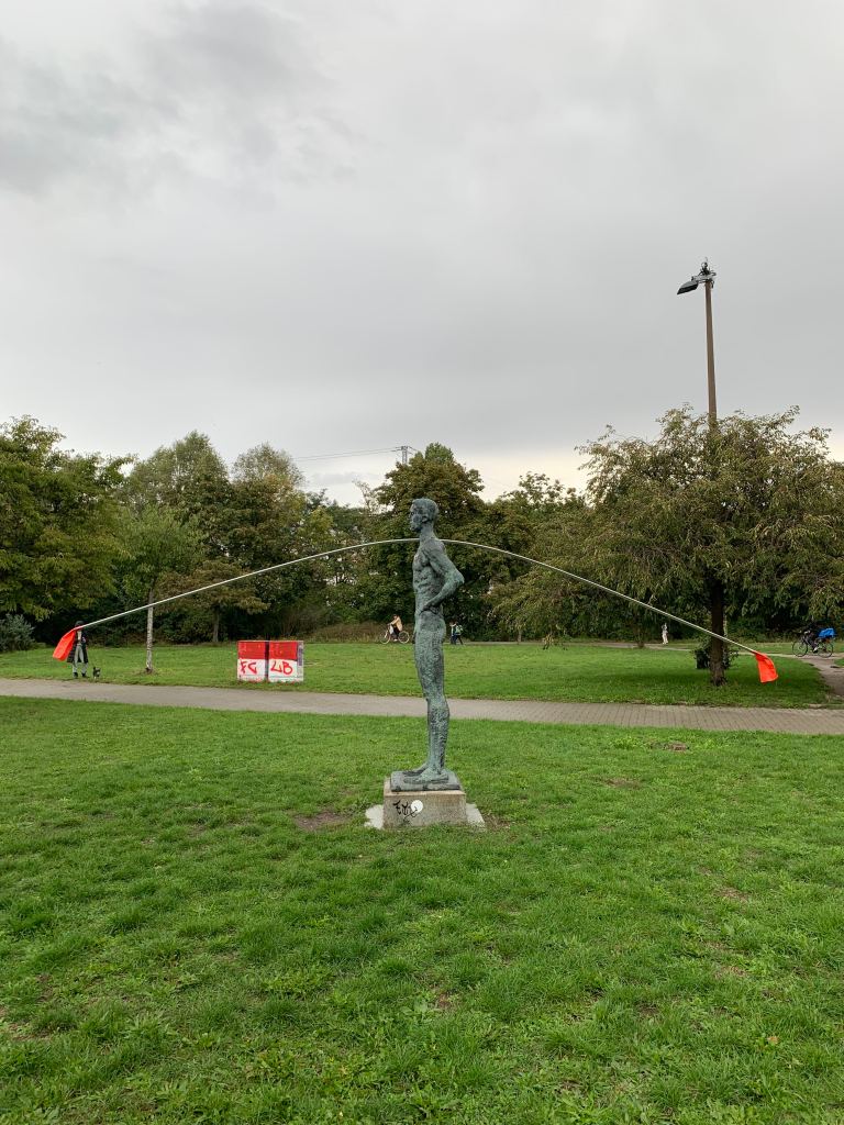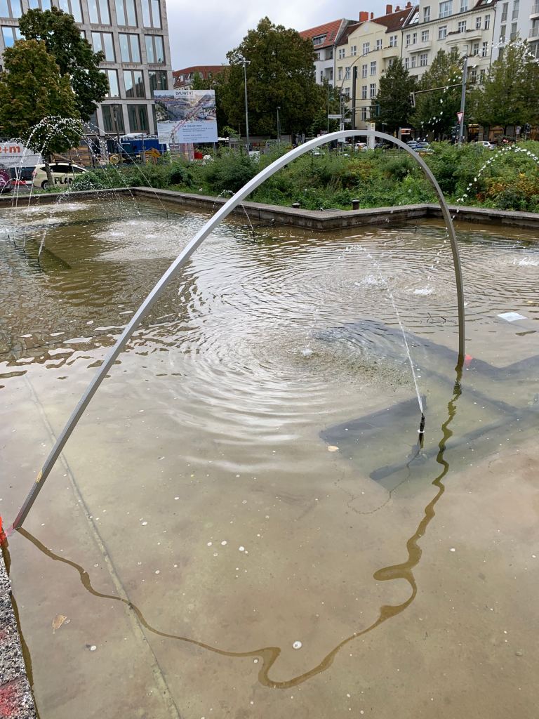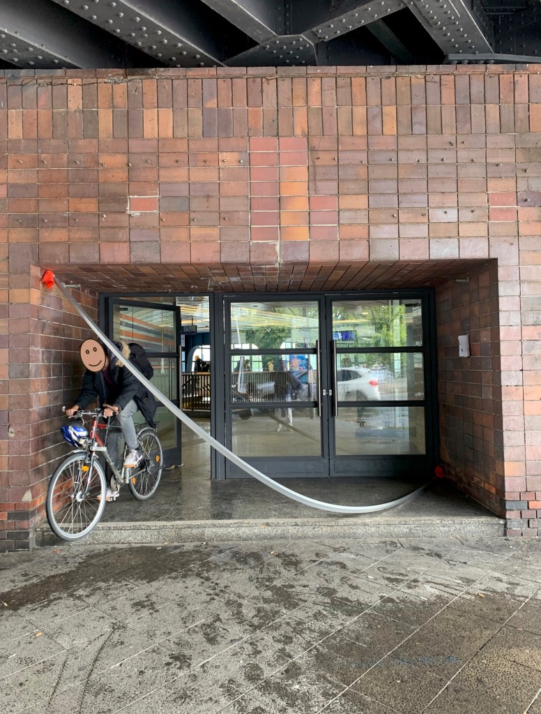 Leidplanke / Nazaré can literally be seen as an ongoing project. I like to call it a ‘performative sculpture’ that can be spontaneously placed here or there like a sign or tag. It accentuates or measures space and its dimensions, it can sweetly reformulate our perception and movement in the city. Further down, you can read some more scrambled thoughts (in German) about the literal form – the L – of the 6m piece of aluminium, which is usually no more than material for framing a painting. Here the frame re-frames situations in the city of Berlin.