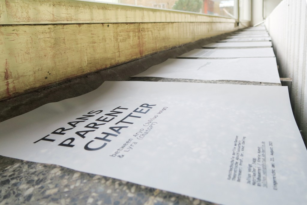 The text below ‘Transparent Chatter’ is a four-day dialogue I conducted via Chat GPT (3.5) about the idea of the human, the artistic and the artificial voice, taking the concept of ‘voice’ very metaphorically here, but also trying to push the Generative Pretrained Transformer (GPT) to its own technical limits when interviewing it about it’s own voice.