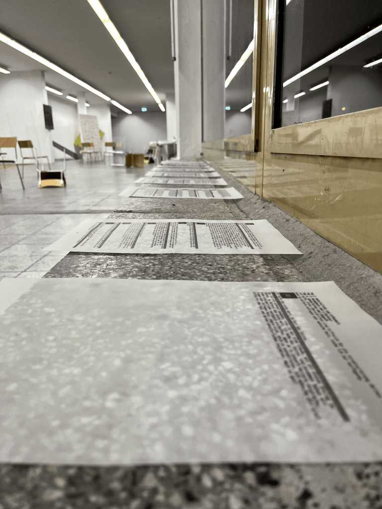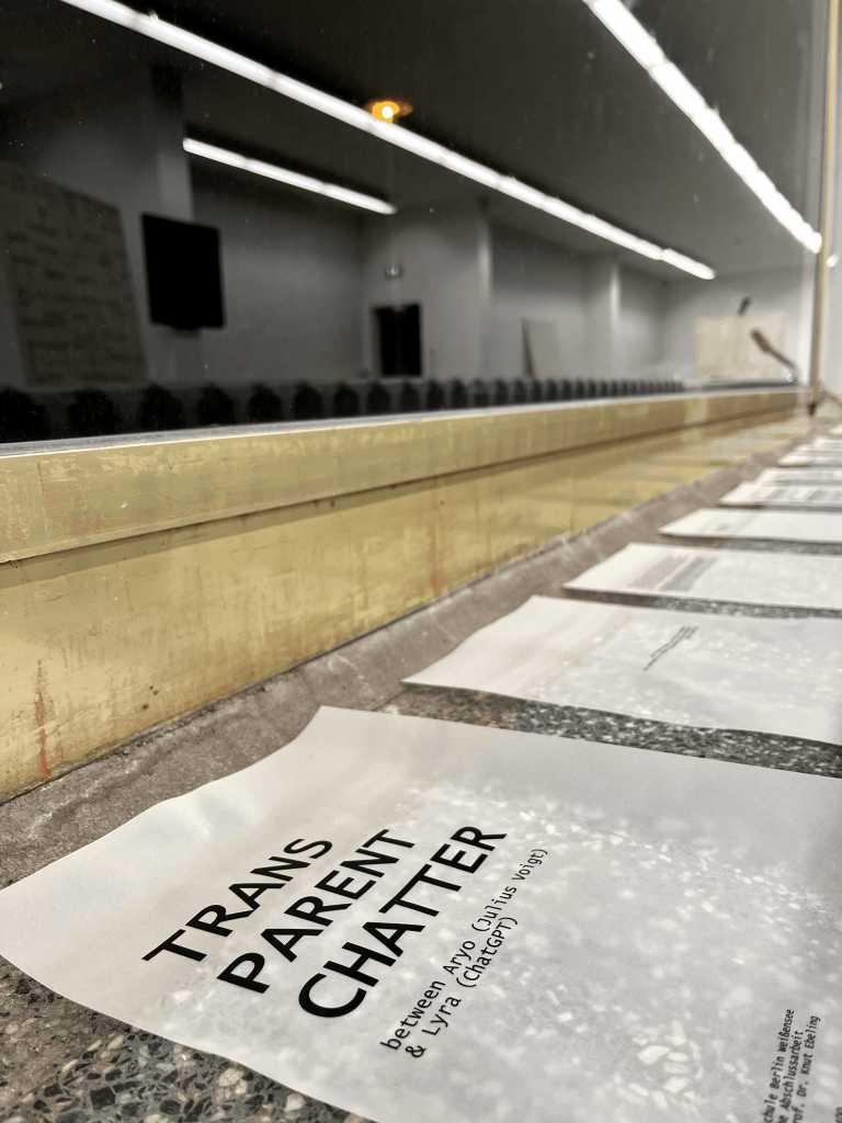In short, the little ‘theme park’ brings together a shifting momentum between seeing and reading, transparency and obscurity, letting go into the other and back again. Then a main negotiation takes place between the realms of artistic and artificial practice and intelligence. The interview below is a re-translation via Chat GPT of the interview I had with Marcel Schwittlick about computational and text art, especially around the idea of cyberspace. The idea of cyberspace as a space without time and space became an interesting pattern. The logic of the installation followed this cyber-spatial fluidity and became very musical and playful, as if the artworks were floating in space. I think this is a very interesting update or take on the great sculptural phenomenon – space – and how we see it. Thanks to my friends and colleagues Shona Stark, Canberk Akçal and Vincent Hüdepohl who joined me in setting up this little ‘concert’.