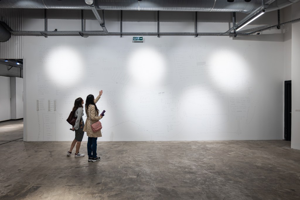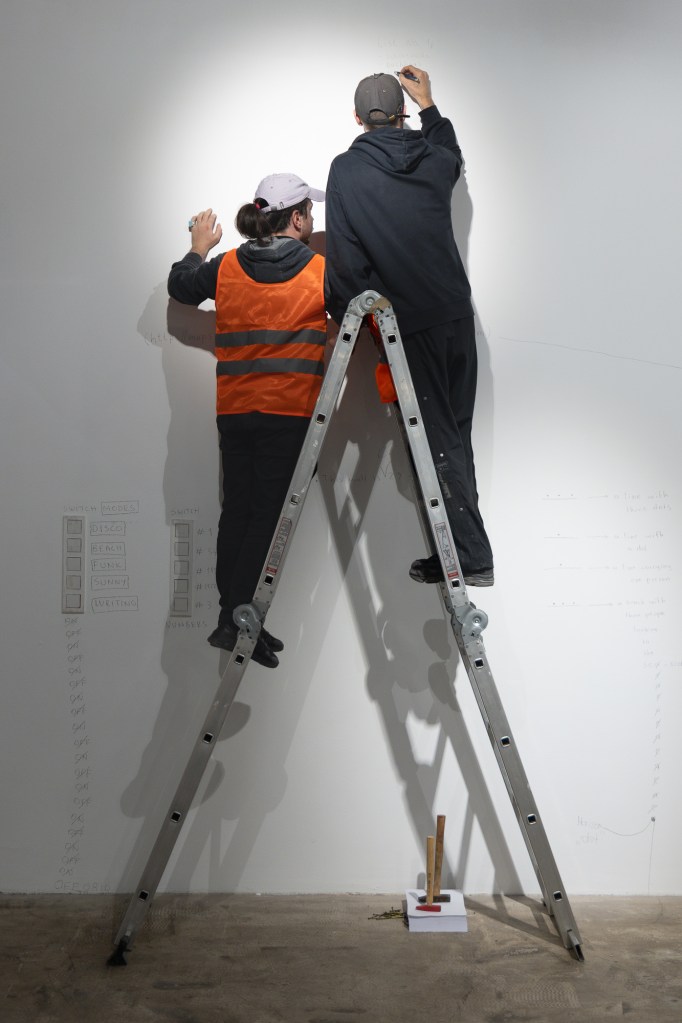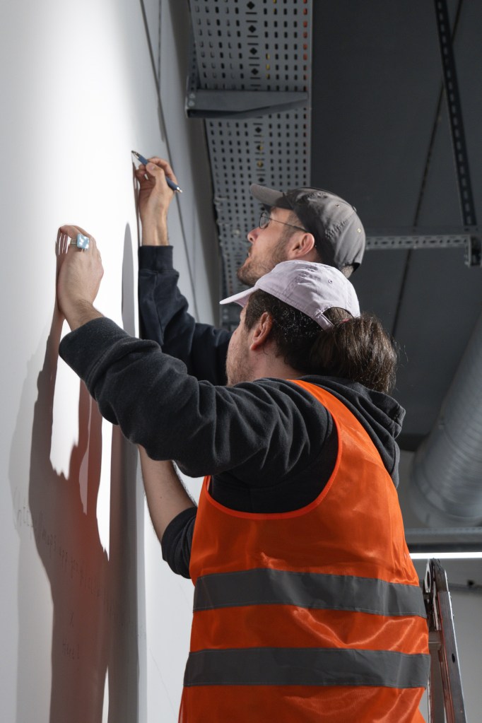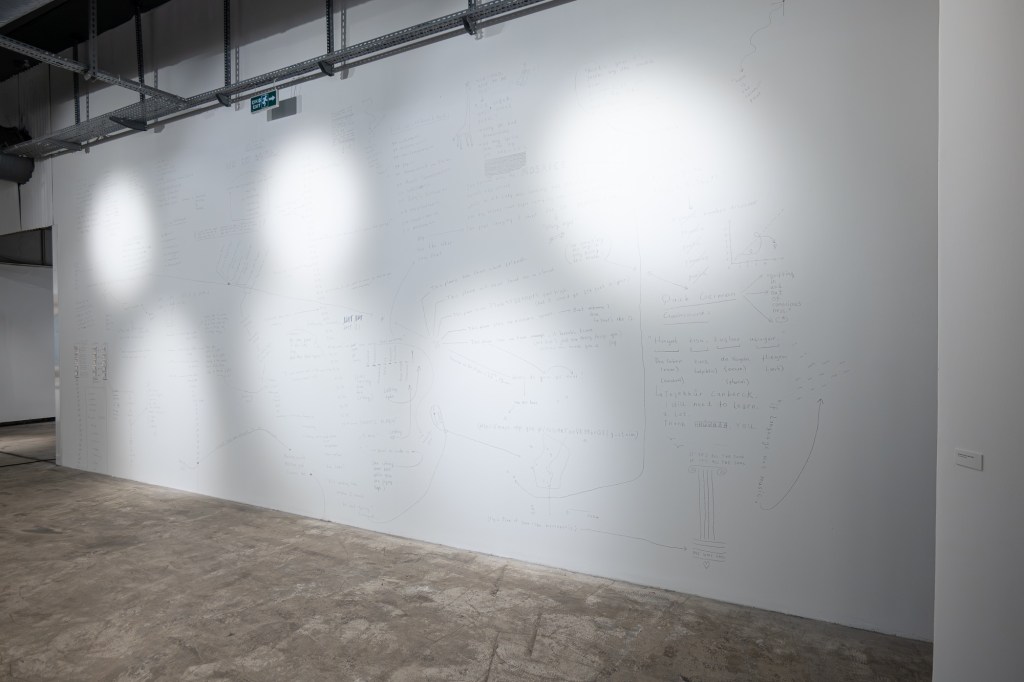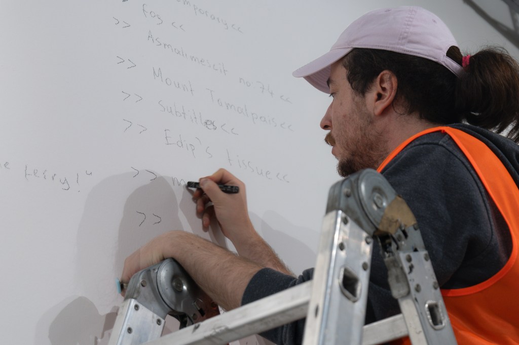 ‘You Are Here!’ was created live at the opening of the exhibition ‚From Artemis to Dara: Remember the Utopia‘ curated by ÖzgÜr aydek and happening at Konak Metro Gallery in Izmir as Part of the Artmeet festival 2025. The writing performance happened over a period of four hours and responds to the central theme of ‘construction’ and the places mentioned in the title (Dara and Ephesus) in an associative, metaphorical and concrete way. The text mural also captures theoretical fragments, personal observations and references from art and, in particular, literature and music, which make up the majority of the work. Altogether it can be understood as an ongoing and unfinished friendly and artistic dialogue between Canberk and me.